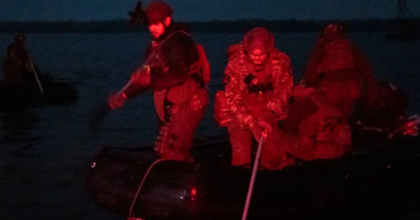 of a special forces unit use oars to push their boats into the water while