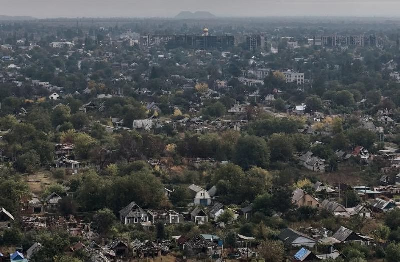 The city of Pokrovsk, Ukraine, is seen from above,