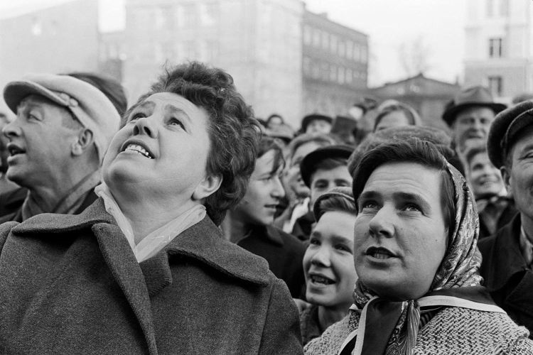 Muscovites gather to watch the news for the latest